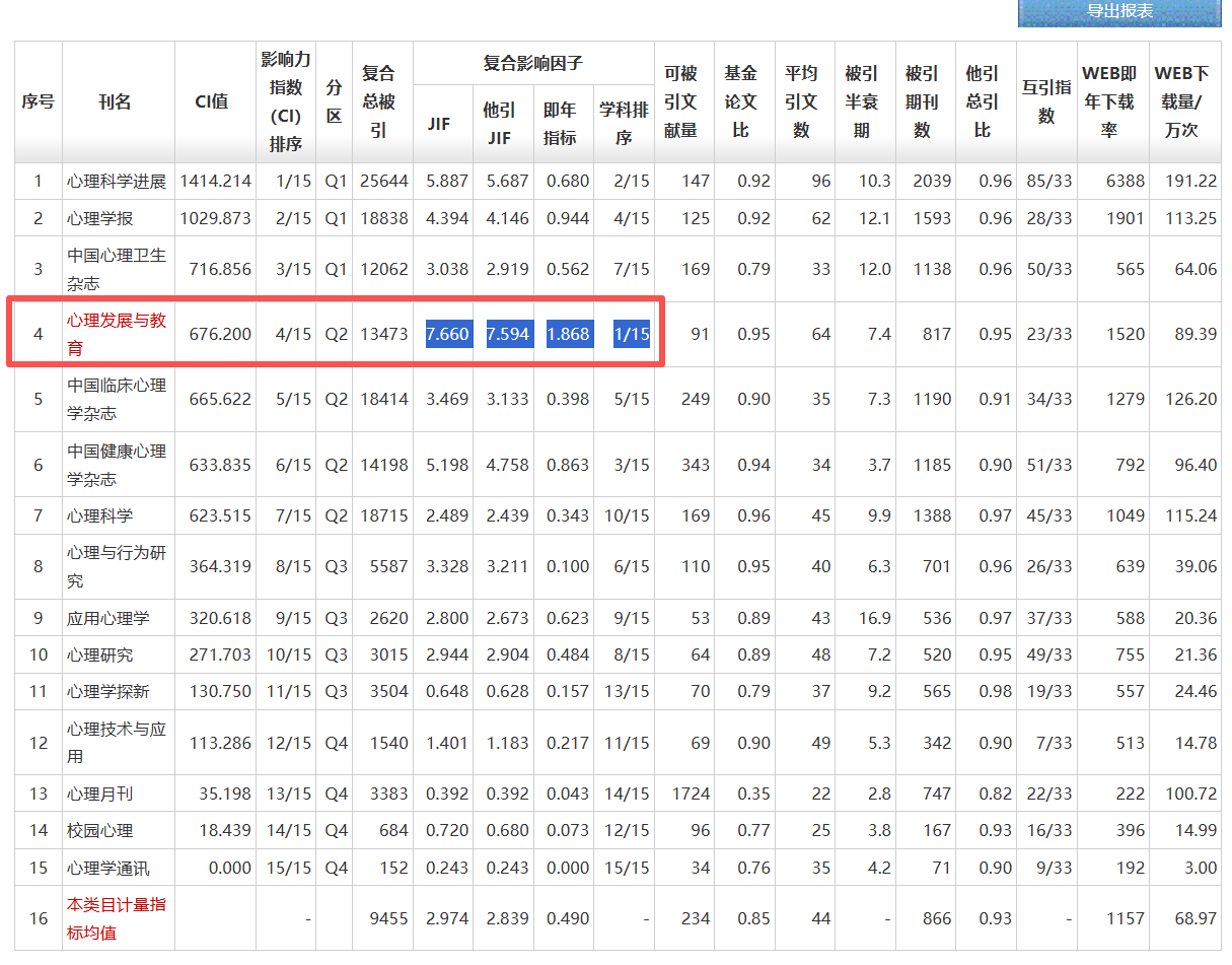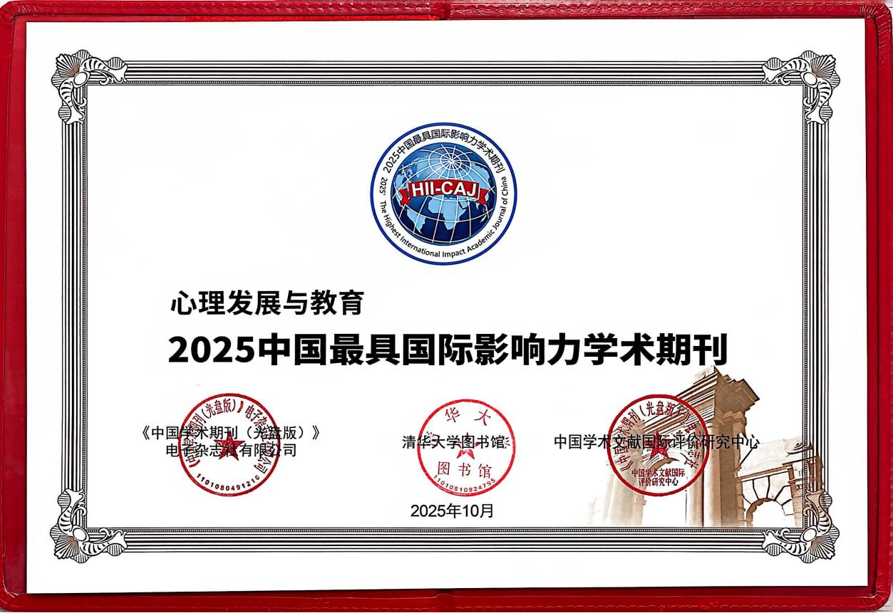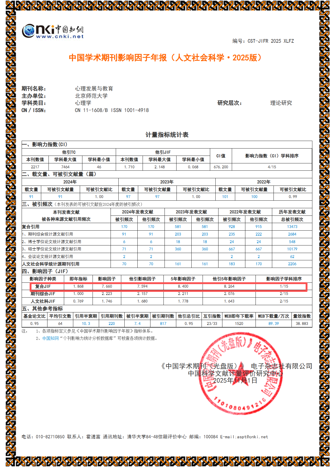 近日,中国知网发布了2025年“中国最具国际影响力学术期刊”榜单以及《中国学术期刊国际引证年报》。《心理发展与教育》再度入选“中国最具国际影响力学术期刊”,并且以复合影响因子7.660,在15本心理学期刊中位居复合影响因子学科排序首位(1/15)。